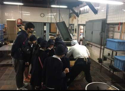 11月13日(金)3年生は、住吉区にある「粟おこし」へ工場見学に行ってきました。米と水あめから、粟おこしになる工程を間近に見ることができました。できたての「おこし」もおいしくいただきました。
