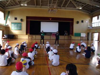 5年生が夢授業でJTマーヴェラスから来られた二人の講師にソフトバレーボールを教えていただきました。