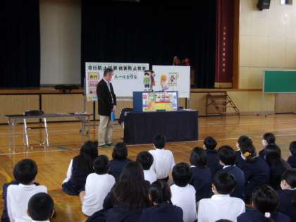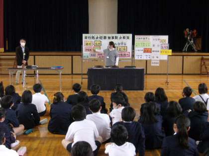 万引き、暴力、飲酒、喫煙、夜遊びといった非行の重大さや危険性、犯罪に巻き込まれないための行動、ルールを守ることの大切さについてなど、ペープサート(紙人形劇)や掲示物でわかりやすく話をしていただきました。