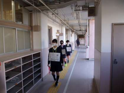 児童会の子どもたちが休み時間に階段や廊下を歩いて、みんなに「廊下を走らないこと」や、「右側通行で安全に歩行すること」などを呼びかけています。