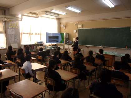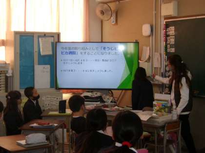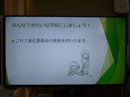 そこで来週の実施に向けて、本日朝8:30に美化委員会の子どもたちが1〜4年生の各教室に行き、作成しておいた「清掃方法のパワーポイント」を使って発表をしました。