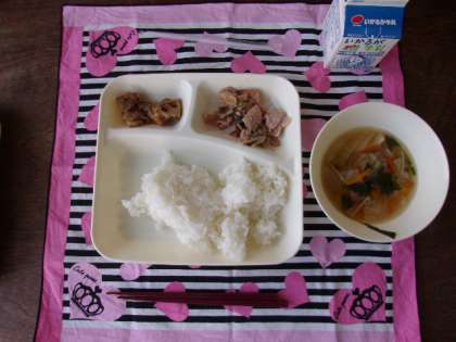 ♦豚肉のねぎじょうゆ焼き♦すまし汁♦れんこんのおかかいため♦ごはん♦牛乳