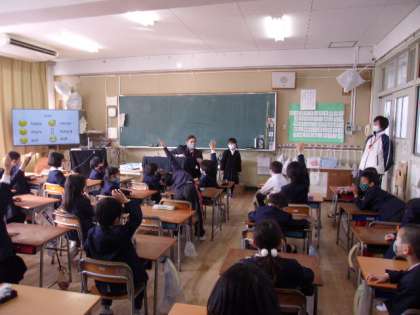 写真上 1年英語:I'm 〜.(〜に入れるのは、happy、angry、sad、sleepy、hungry、sickのいずれか)黒板の前に出て、happy等いずれかのカードを見せてもらい、それをジェスチャーで表現してみんなに伝えるゲーム、など。