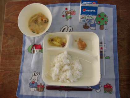 今日の給食のかす汁には、さけ、つきこんにゃく、うすあげ、だいこん、にんじん、青ねぎが入っていました。