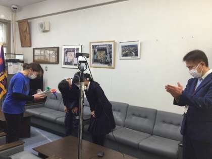 ※写真は、1月25日の児童朝会(Teamsによるオンラインで実施)で、全校児童を代表して給食委員会の代表の人から、調理員さんの代表の人に感謝の手紙を渡しているところです。みんなで読ませていただきますと声をかけていただきました。