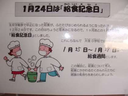 太平洋戦争で中止になった給食が再び始められたのが12月24日です。この日が冬休みになるので、1か月後の1月24日を「給食記念日」としました。