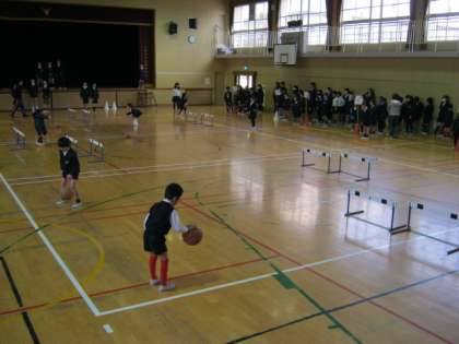 2月12日、児童集会をしました。講堂では各学年の3組が集まって、たてわり班で「障害物競争」に挑戦しました。なわとび、ハードル、ボールつきをして、次の人に交代します。1年生も上手に出来ていました。