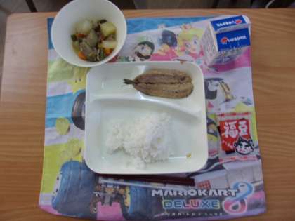 ♦いわしのしょうがじょうゆかけ♦含め煮♦いり大豆♦ごはん♦牛乳