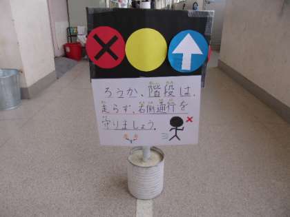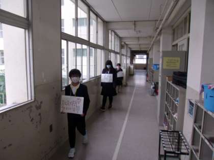 児童会の子どもたちが休み時間に階段や廊下を歩いて、みんなに「廊下を走らないこと」「右側通行で安全に歩行すること」や、「密にならないように」などを呼びかけています。