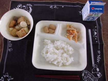 ♦関東煮♦甘酢あえ♦白花豆の煮もの♦ごはん♦牛乳