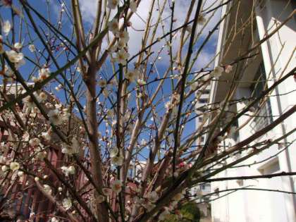 写真上 体育館南側でそっと咲いている、満開が近い小さな白梅。