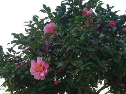 写真中 体育館北側で誇らしげに咲いている、大きなピンクの山茶花。