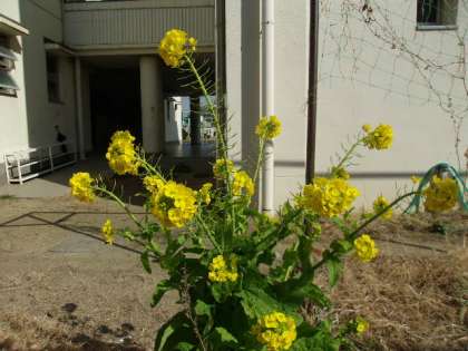 写真下 南校舎南側で元気いっぱいに咲いている、色鮮やかな菜の花。
