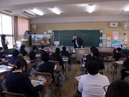 写真下 6年英語:教科書P.104〜「Junior High School Life」What club do you want to join? I want to join the basketball team. など。