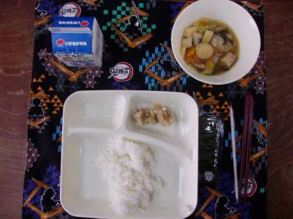 ♦鶏肉のからあげ♦まる天と野菜のうま煮♦焼きのり♦ごはん♦牛乳