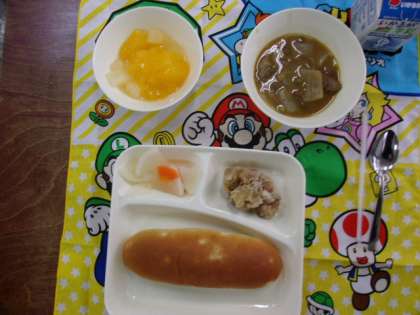 ♦フライドチキン♦カレーシチュー(近江牛)♦おいわいピクルス♦フルーツゼリー♦おさつパン♦牛乳