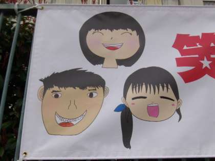 見た人たちが思わずにっこりするような、にこにこ笑顔のイラストを子どもたちから募集したところ、たくさんの作品が集まりました。そこで、1年生から6年生まで、各学年の作品を1点ずつ選んで印刷することにし、横断幕を完成させました。