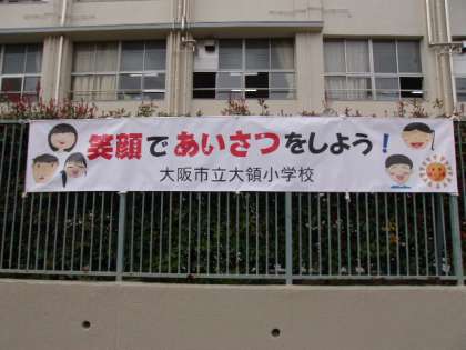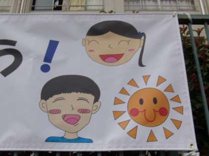 「笑顔であいさつをしよう!」の言葉の前と後ろに、子どもたちから募集した笑顔のイラストを印刷した、“あいさつ運動横断幕”を正門の少し南側に取り付けました。