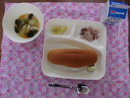 ♦豚肉のガーリック焼き♦スープ♦サワーソテー♦コッペパン(添加物:バター)♦牛乳