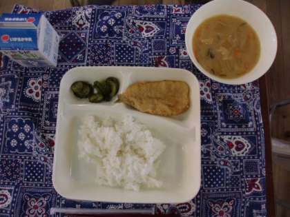 ♦いわしのフライ♦みそ汁♦きゅうりの赤じそあえ♦ごはん♦牛乳