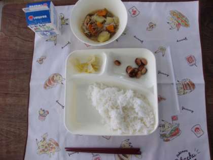 ♦肉じゃが♦はくさいのゆず風味♦とら豆の煮もの♦ごはん♦牛乳