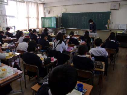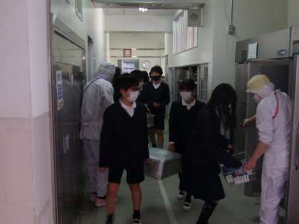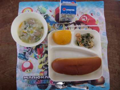 ♦えびと野菜のいためもの♦中華がゆ♦はっさく♦こくとうパン♦牛乳