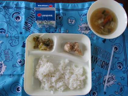 ♦鶏肉のからあげ♦中華スープ♦チンゲンサイともやしの甘酢あえ♦ごはん♦牛乳