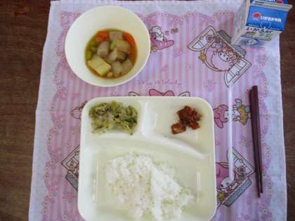 ♦まぐろのオーロラ煮♦含め煮♦キャベツの赤じそあえ♦ごはん♦牛乳