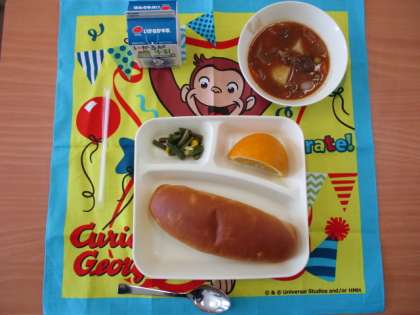 ♦ビーフシチュー♦さんどまめとコーンのサラダ♦あまなつかん♦おさつパン♦牛乳