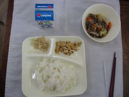 ♦肉じゃが♦もやしのゆずの香あえ♦ごまかかいため♦ごはん♦牛乳