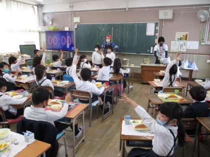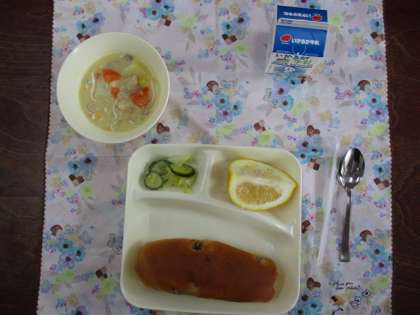 ♦コーンクリームシチュー♦キャベツときゅうりのサラダ♦かわちばんかん♦レーズンパン♦牛乳