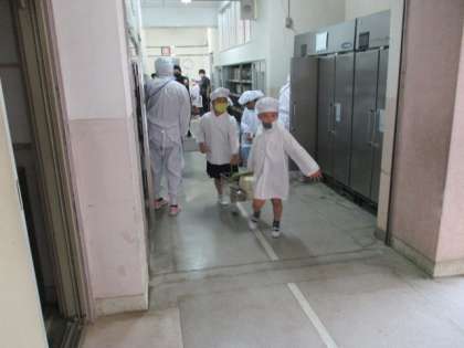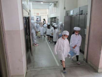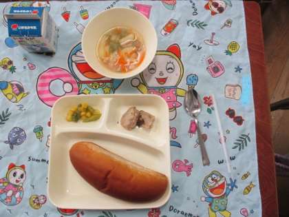♦かつおのガーリックマヨネーズ焼き♦ベーコンと野菜のスープ♦グリーンアスパラガスのソテー♦こくとうパン♦牛乳