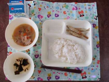 ♦きびなごてんぷら♦豚汁♦わかたけ煮♦ごはん♦牛乳