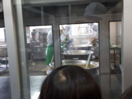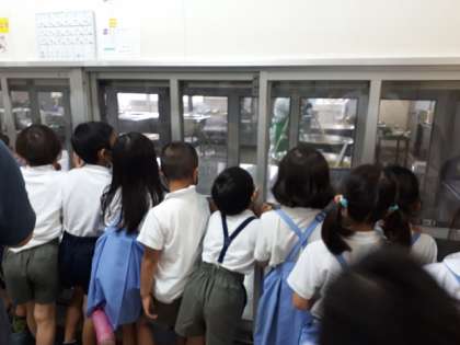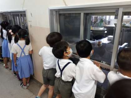 1年生が生活科の「学校探検」で、昨日からクラスごとに給食調理場を見学に行きました。