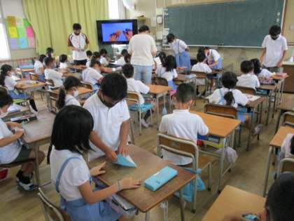 1年生から3年生の教室では、6年生がそのまま教室でおりづるの折り方を伝えました。各教室で6年生のやさしさが光っていました。