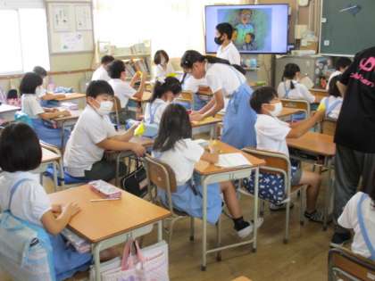 6年生による1〜5年生の子どもたちへの「読み聞かせ」の後は、各学級でおりづるを折りました。