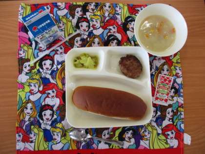 ♦焼きハンバーグ♦豆乳スープ♦キャベツとピーマンのカレーソテー♦こくとうパン♦牛乳
