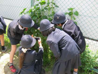 4月15日、4年生は理科で「春の生き物」の学習をしています。今日は北運動場へ行って花や虫を探しました。グループごとに見つけた生き物を写真に撮ったり、虫めがねで観察したりしていました。