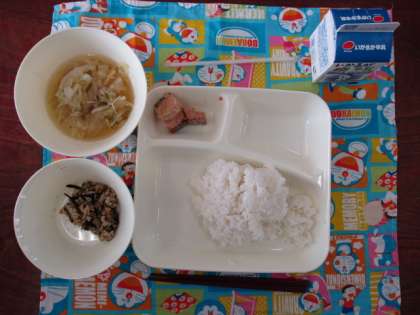 ♦さけのしょうゆ風味焼き♦五目汁♦高野どうふのいり煮♦ごはん♦牛乳