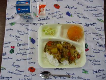 ♦チキンカレーライス【米粉】♦キャベツとコーンのサラダ【ノンエッグドレッシング】♦みかん(冷)♦牛乳