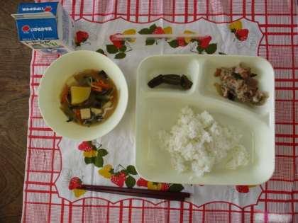 ♦豚肉の甘辛焼き♦みそ汁♦オクラのおかかいため♦ごはん♦牛乳
