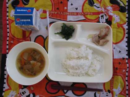 ♦鶏肉のゆず塩焼き♦ソーキ汁♦ほうれんそうのおひたし♦ごはん♦牛乳