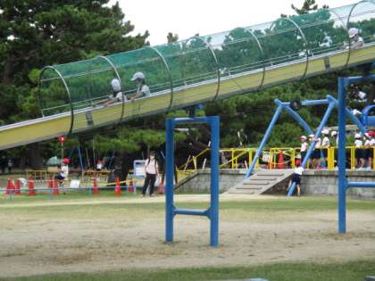 浜寺公園では、はじめにばら庭園を少し見学しました。古い品種から最近のものまで約種300種6,500本のバラが植えられているそうです。次に南児童遊戯場でたくさん遊びました。ユニークなタコのすべり台がありました。