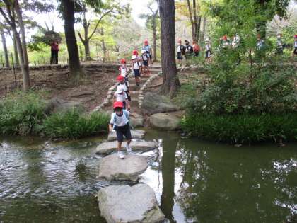 少し休んだ後、歴史の森を歩いてまわりました。一人ずつ、飛石を歩いて川を渡る冒険もしました。子どもたちは楽しそうに渡っていました。みんな無事に渡ることができました。