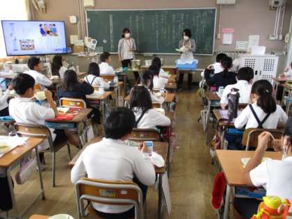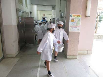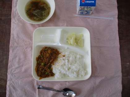 給食では、牛ひき肉、豚ひき肉、たまねぎなどをいため、味つけし、ごはんにかけて食べました。