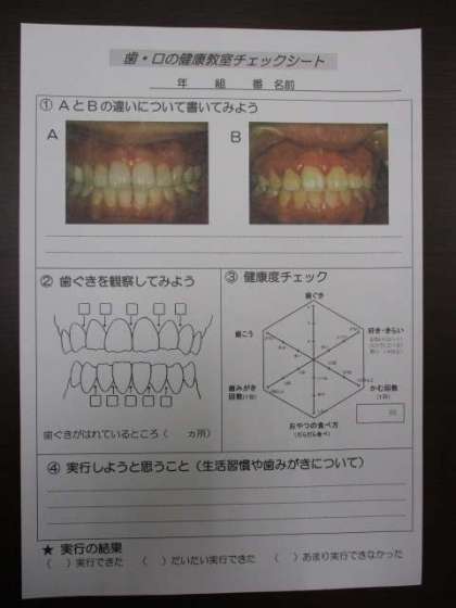 新型コロナウイルス感染症対策のため、実際に歯ぐきを観察することはできませんでしたが、「歯ぐき」「歯こう」「歯みがき回数(1日)」「おやつの食べ方(だらだら食べ)」「かむ回数」「好き・きらい」をもとに健康度チェックを行いました。