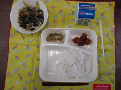 ♦まぐろのオーロラ煮♦すまし汁♦もやしとピーマンのいためもの♦ごはん♦牛乳