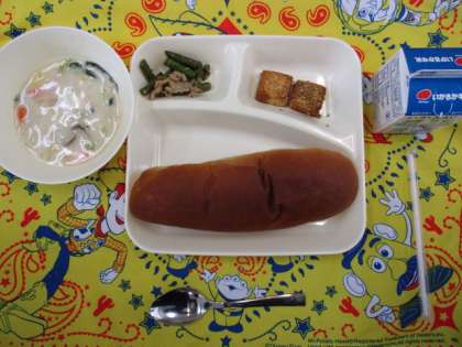 ♦はくさいのクリーム煮♦あつあげのごまじょうゆかけ♦豚肉とさんどまめのオイスターソースいため♦こくとうパン♦牛乳