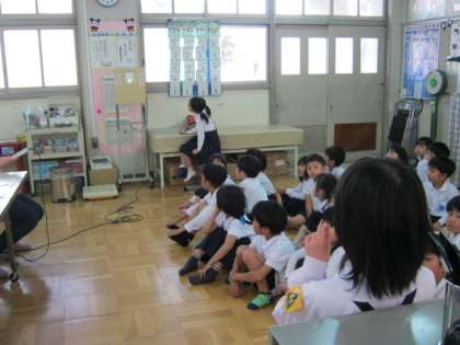 4月、5月は保健に関する行事がたくさんあります。4月には発育測定や聴力検査、視力検査を行いました。5月1日は、1年生の視力検査でした。保健室の剱先生にやり方を教えていただき、一生懸命指で示していました。