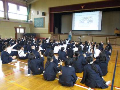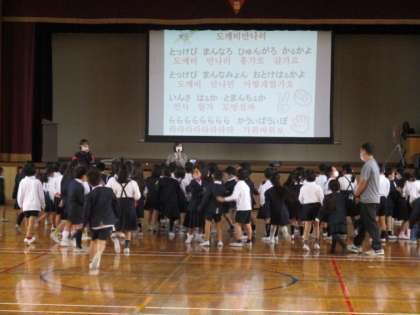 民族講師をお招きして、1年生と5年生に課内実践の授業を行いました。1年生は韓国・朝鮮のお話を聞き、あいさつやじゃんけん、歌をみんなで学びました。5年生はクイズ形式で韓国・朝鮮の文化を学びました。